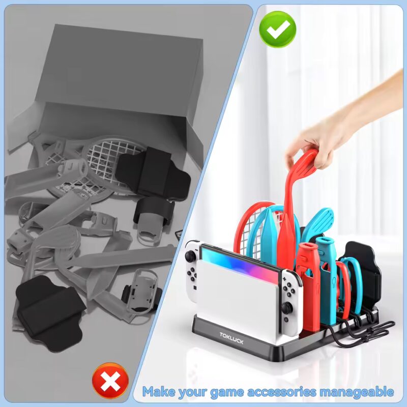 - for Switch Sports Accessories Set Stand 15-in-1, This switch accessories kit stand comes with an assortment of accessories that compliment your Switch games, including 2 x Tennis Rackets, 2 x Golf Clubs, 2 x Shared Grips, 2 x Sword, 2 x Wrist Bands, 2 x Leg Strap, 4 X Lanyard, 2 X Bowling Grip, 1 X Storage Stand. Easy to use, adds more fun and flexibility to your Switch.